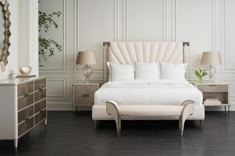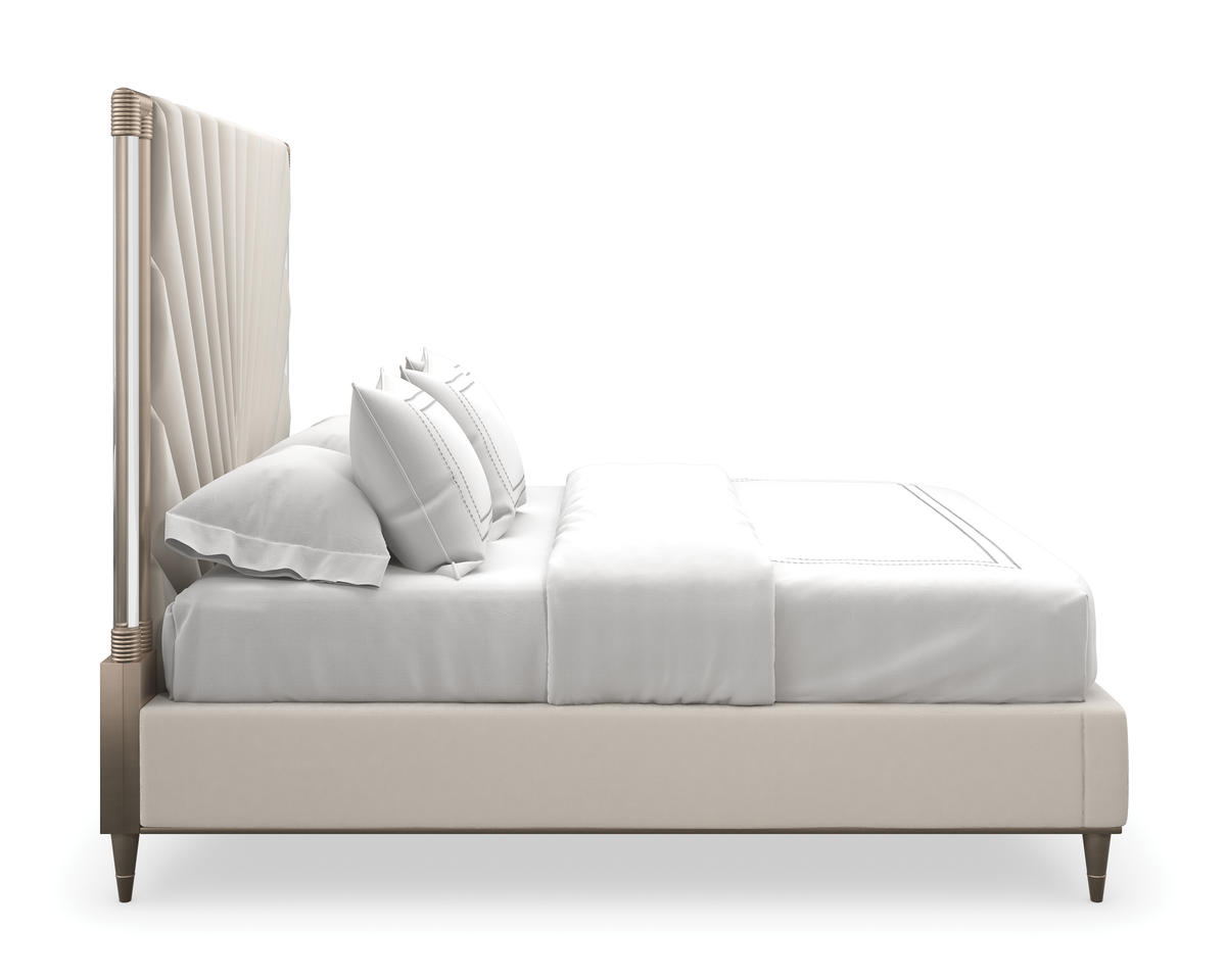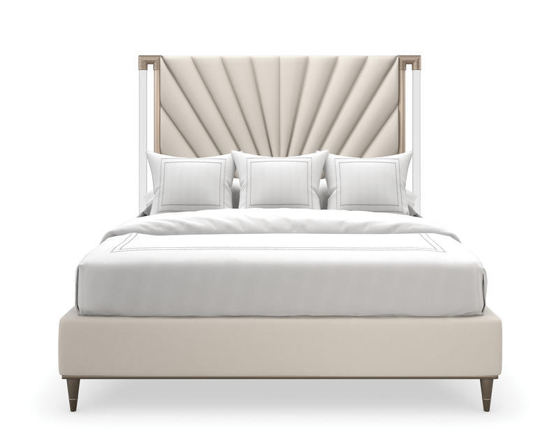 Softly radiating with an air of luxury, the Valentina bed features an exquisitely tailored headboard, composed of individual upholstered wedge panels, elegantly framed by clear acrylic posts. Its subtle layering of color and material lends a soothing presence, artfully accentuated by details in a Golden Shimmer finish.