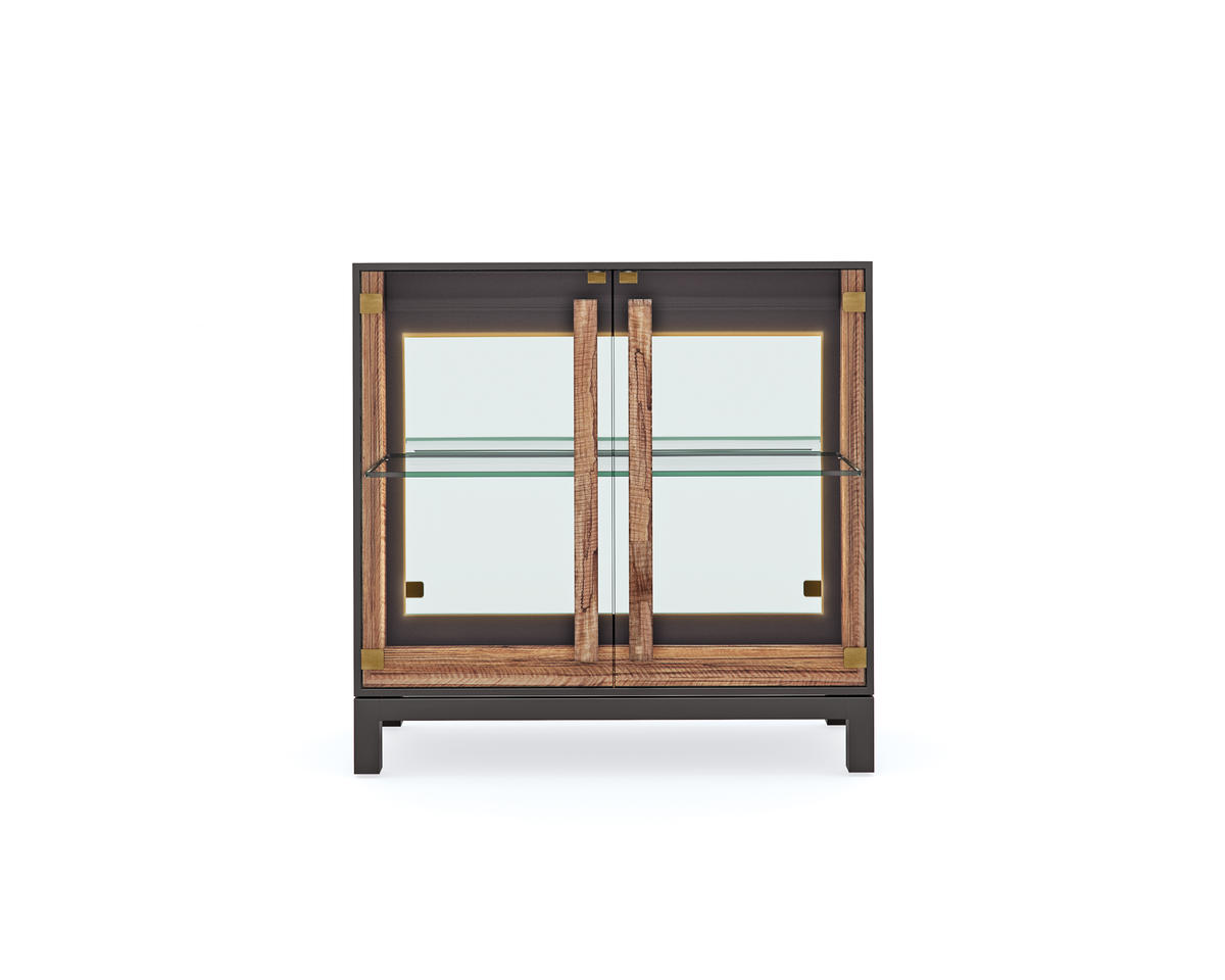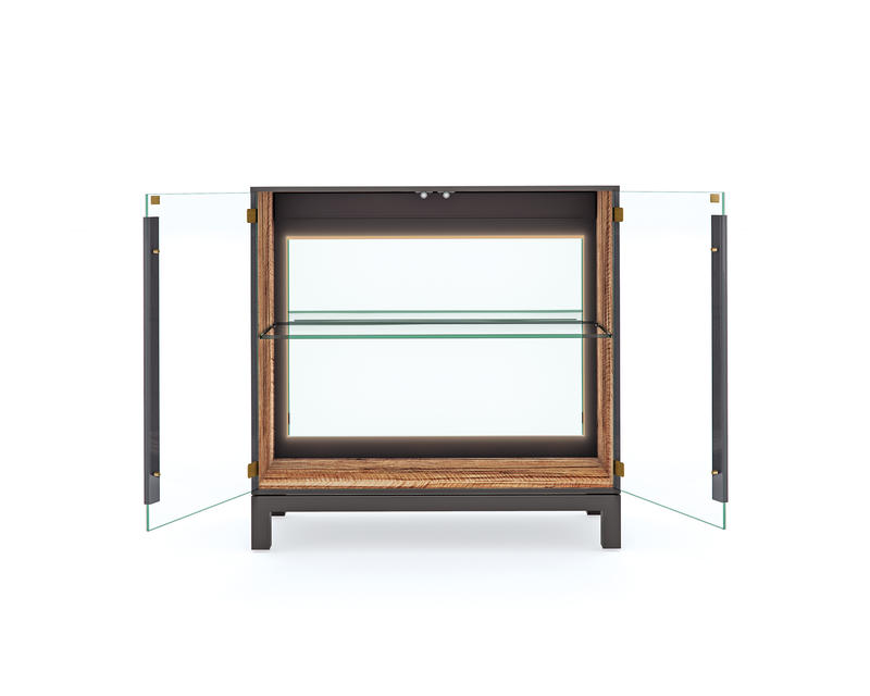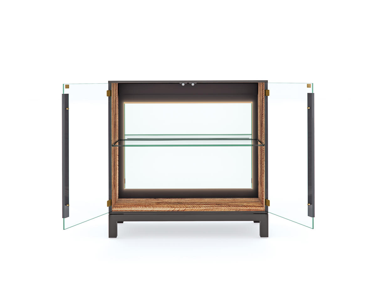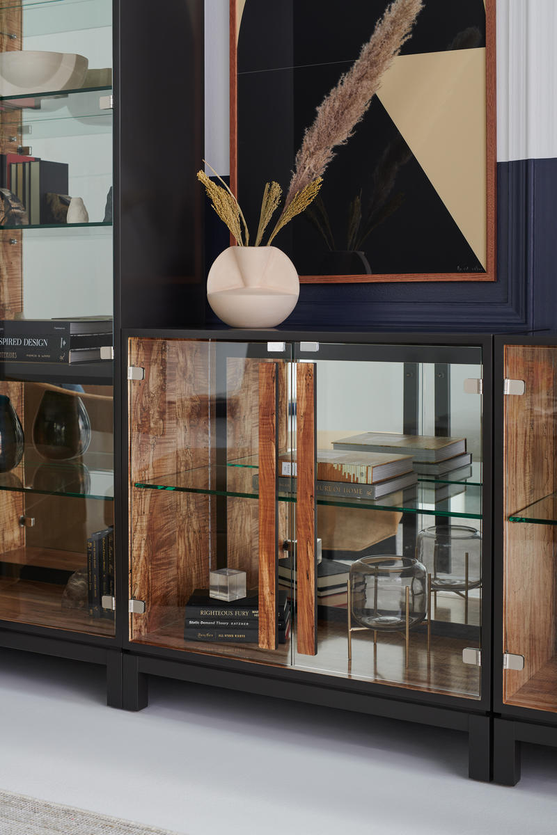 Integrating architecture with materials found in nature, this streamlined cabinet illuminates curated displays and collectables. Finished in Greenway, a complex mix of dark brown, black, and olive tones, the case exterior offers rich contrast to the door handles and interior, made from a digitally printed spalted maple. Linear in design and visually light, it has two glass doors, one adjustable glass shelf, and a single, wood-framed glass shelf. Features a back-lit mirrored panel with LED lighting. Modular design lets you style in pairs with our Handle It cabinet to fill a wall and create your own display.