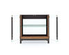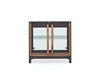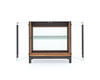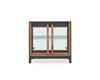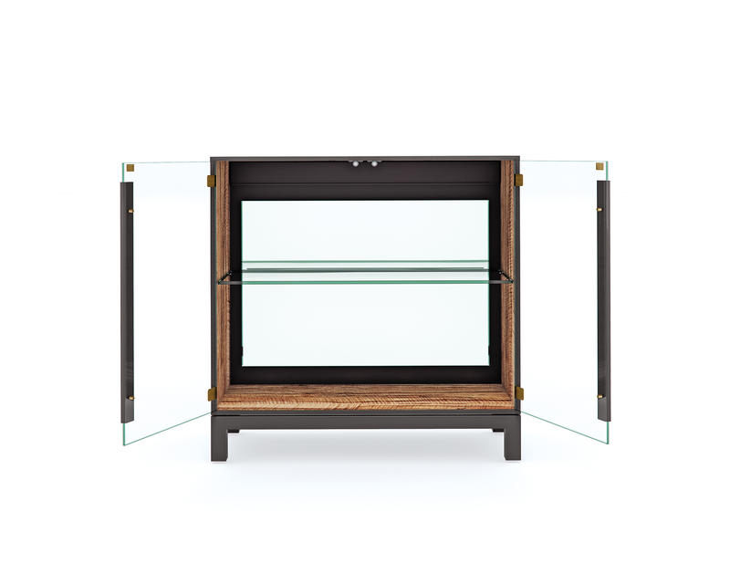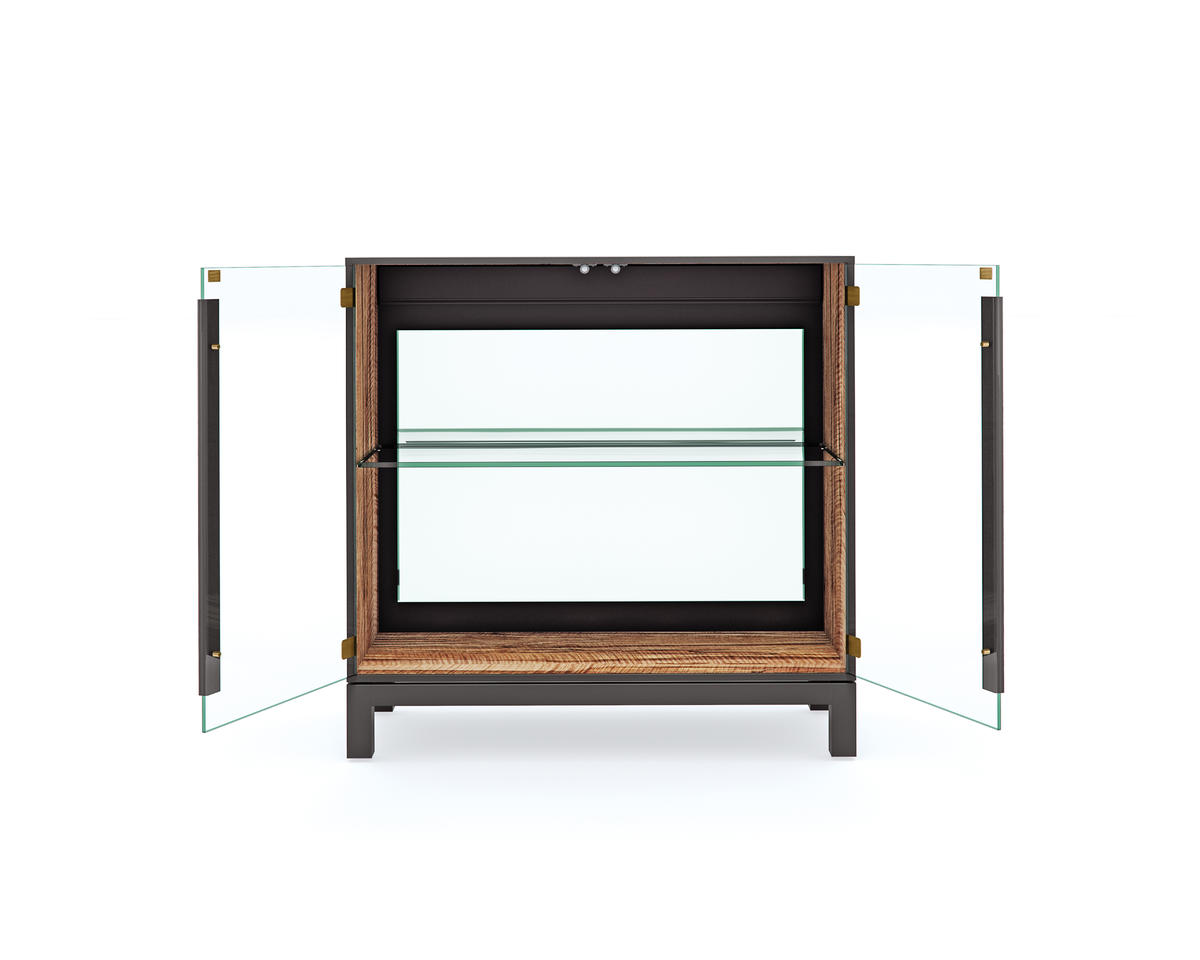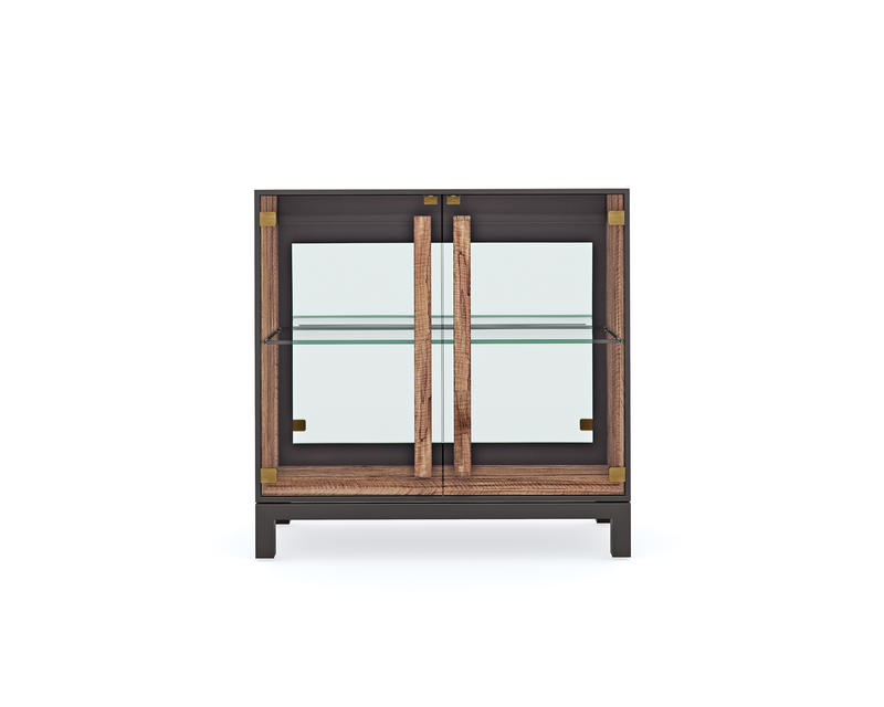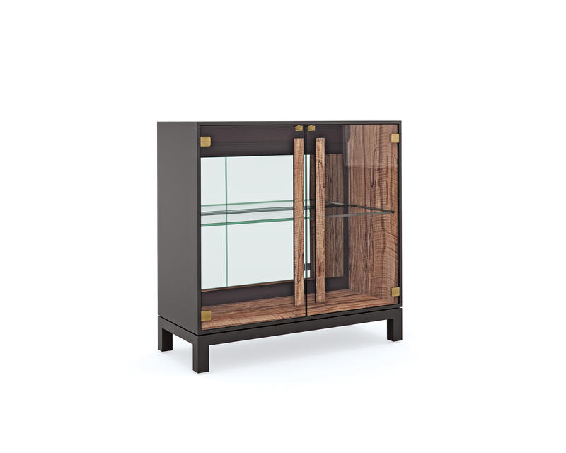 Integrating architecture with materials found in nature, this streamlined cabinet illuminates curated displays and collectables. Finished in Greenway, a complex mix of dark brown, black, and olive tones, the case exterior offers rich contrast to the door handles and interior, made from a digitally printed spalted maple. Linear in design and visually light, it has two glass doors, one adjustable glass shelf, and a single, wood-framed glass shelf. Features a back-lit mirrored panel with LED lighting. Modular design lets you style in pairs with our Handle It cabinet to fill a wall and create your own display.