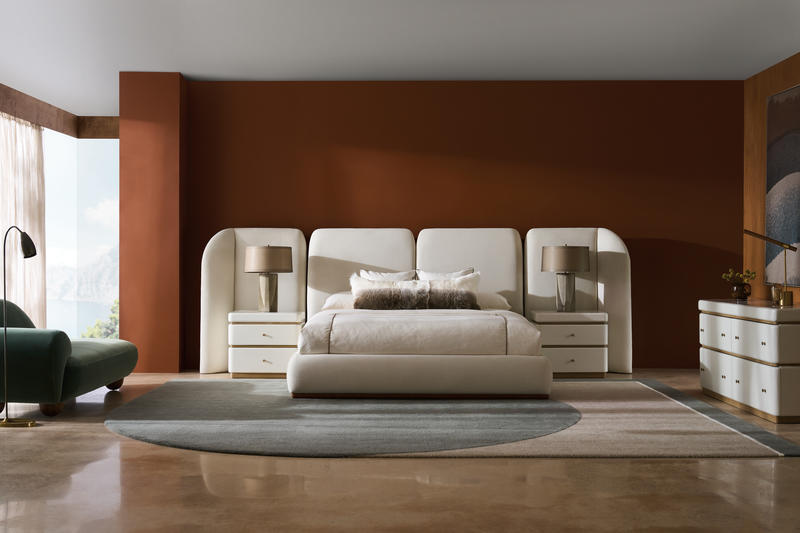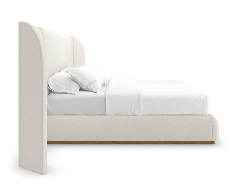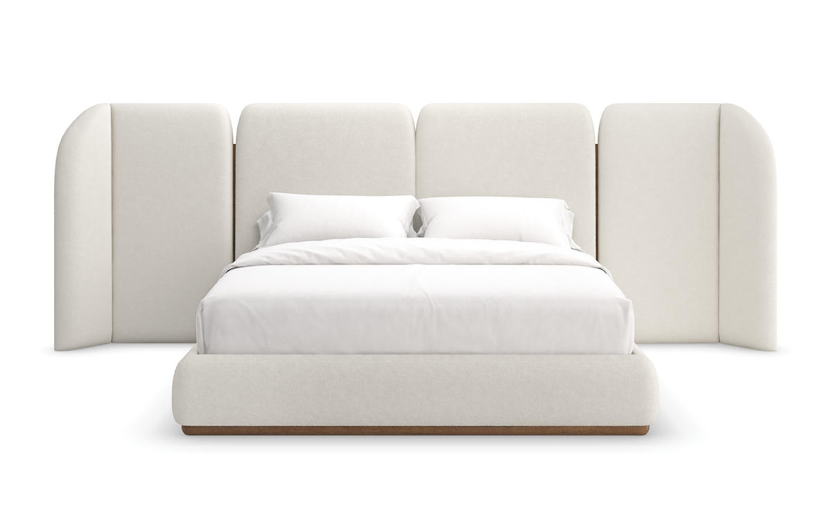 With its soothing symmetry and softly rounded edges, this fully upholstered bed recalls the whitewashed architecture found along the Amalfi coast. Meticulously tailored in a lush, deep-pile microfiber, with Toasted Pecan accents to complement its simple yet elegant aesthetic. Extend the view and further indulge the senses with sculptural wing panels, available for purchase separately.