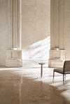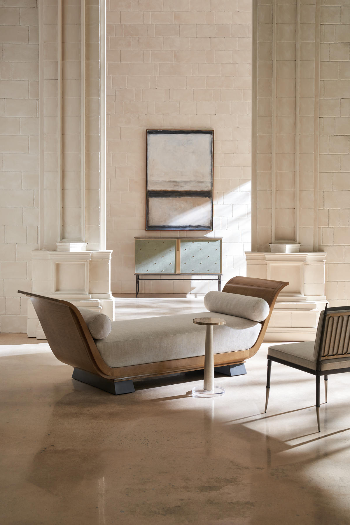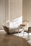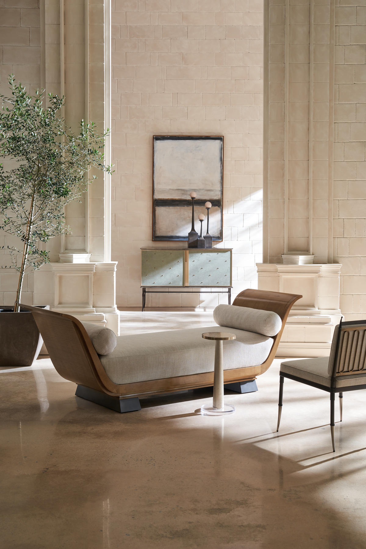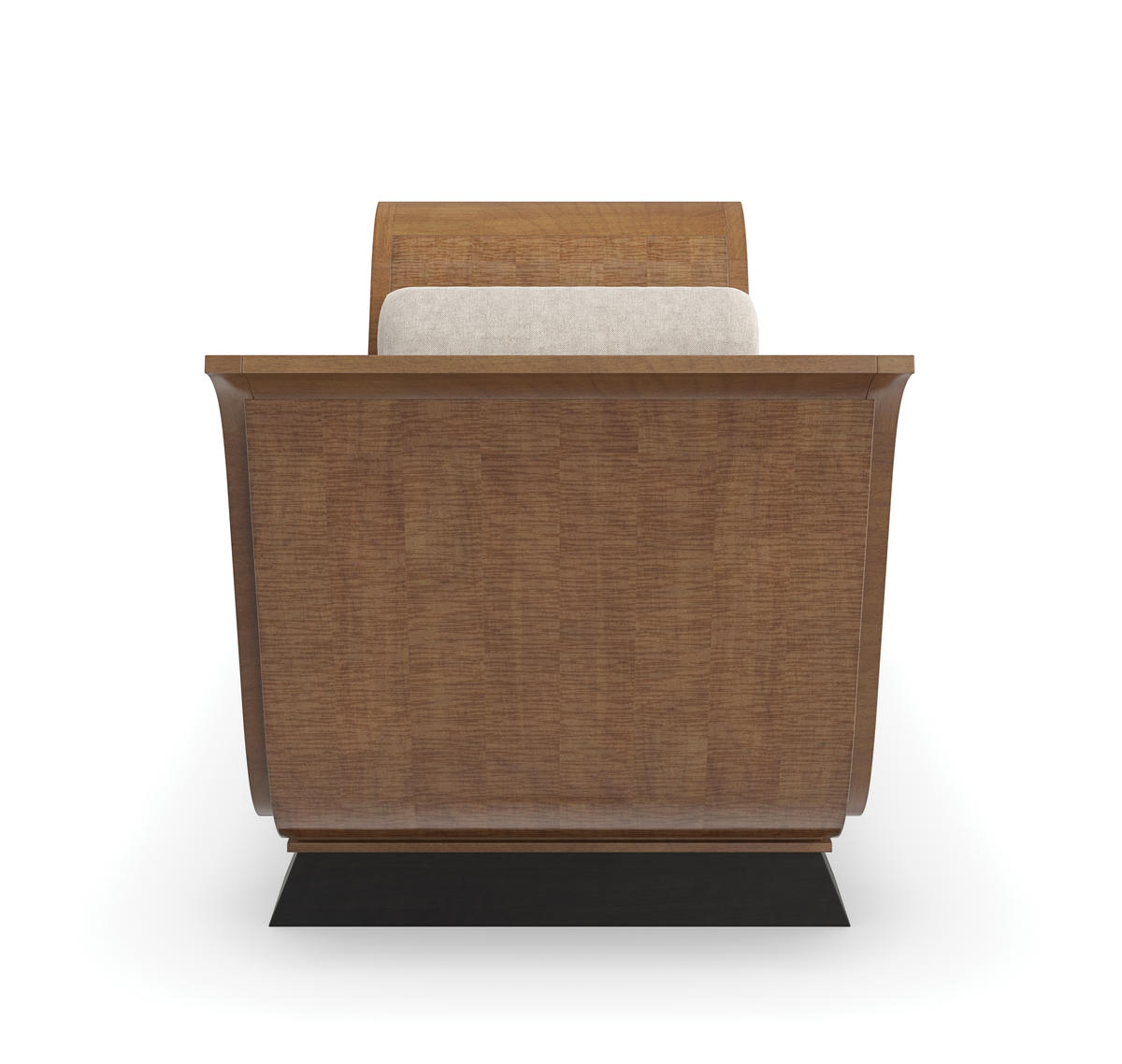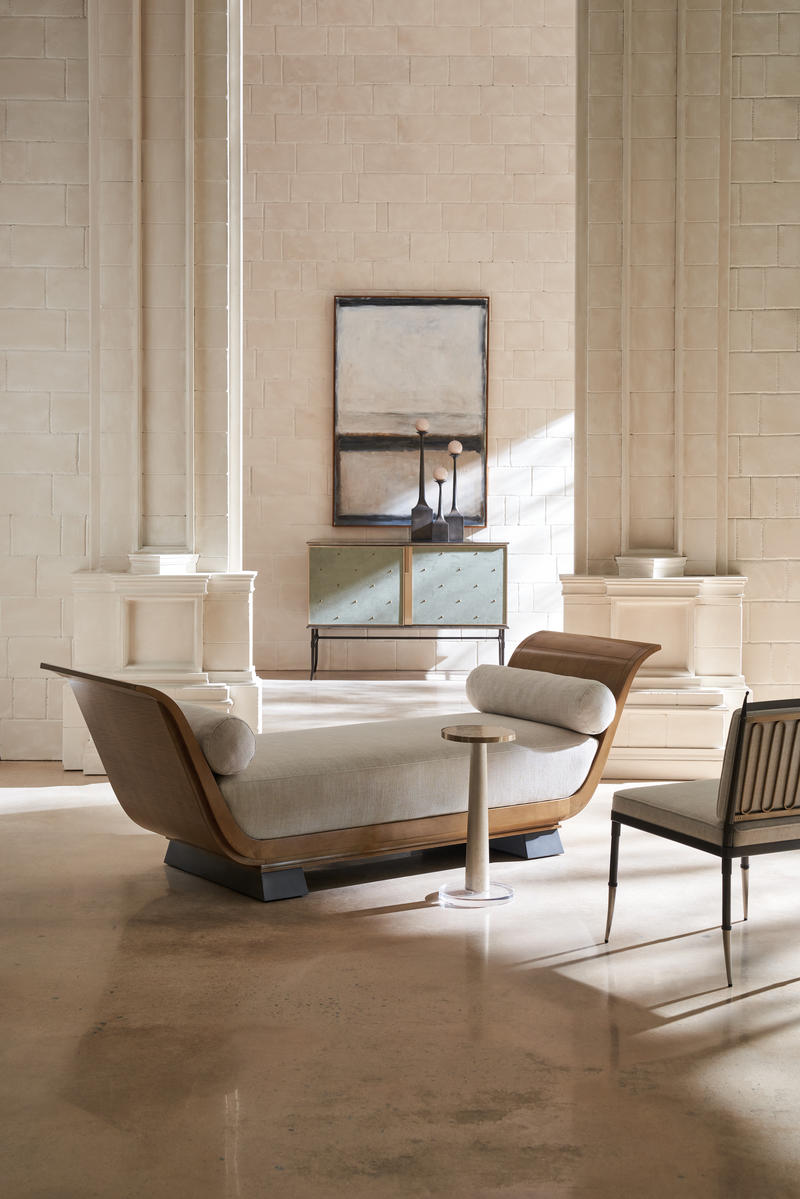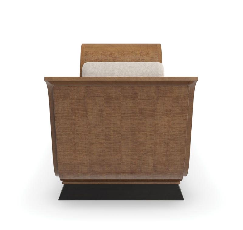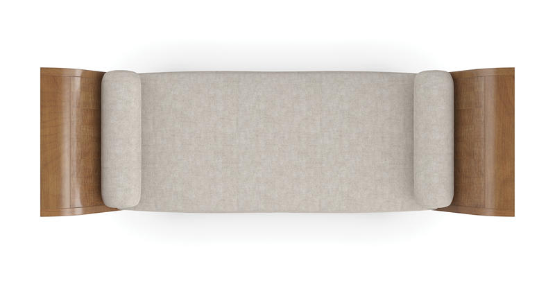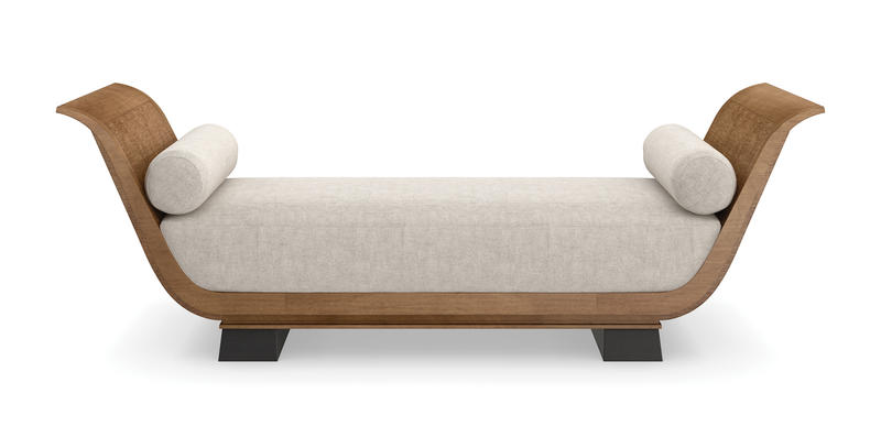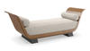 With a nod to Greek and Roman antiquity, this chaise introduces lounge-like comfort and a classic undertone. Its daybed form recalls pieces used throughout history to lounge comfortably yet respectably in the presence of guests. Dressed in a light-toned linen with matching bolster pillows, warmly contrasted by an arcing frame in Toasted Sycamore and plinth legs in a rich Charred Bark finish. Style in a seating area designed for conversations or use it to separate two designated spaces in a room.